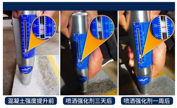 3.使用工具:滚筒涂刷或喷雾器喷晒:第一天喷涂5~6遍,第二天喷涂2~3遍(每次喷涂至混凝土表面完成湿润,保证混凝土充分吸收)每次涂刷间隔20~60分钟左右,施工完后,1~2天见效,5~7天达到最理想效果。可用回弹仪测试。